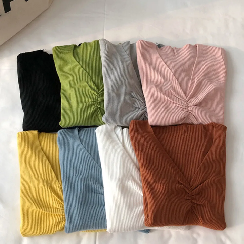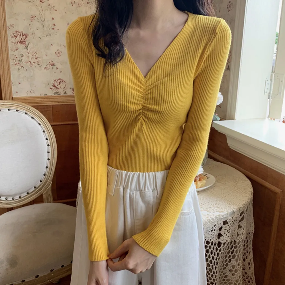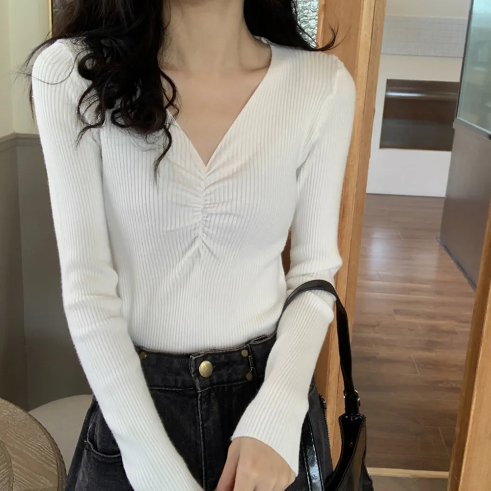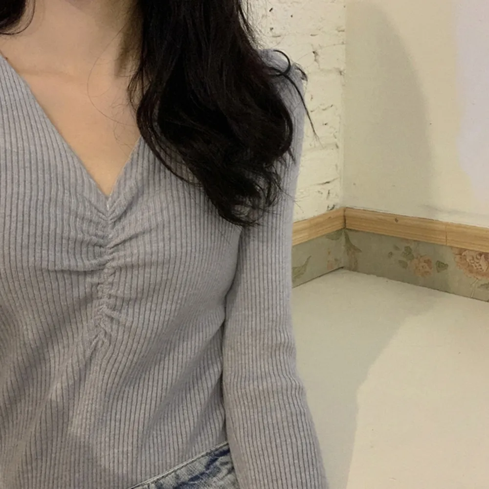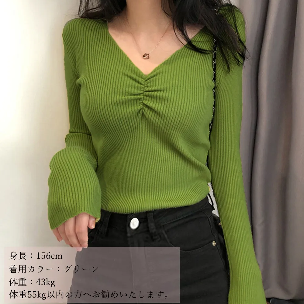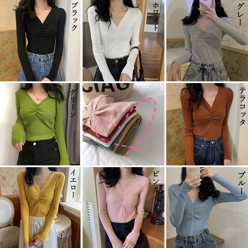 ギャザーリブニットトップス レディース秋冬 Vネック ストレッチ 着やせ効果 ワンピース対応 カジュアル・きれいめコーデOK
