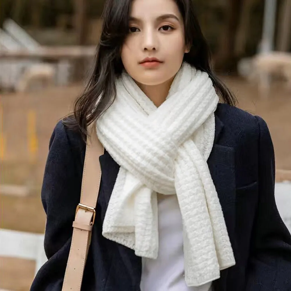 秋冬ファッションのワンポイントにしたいふっくら編み込まれたニットマフラーです