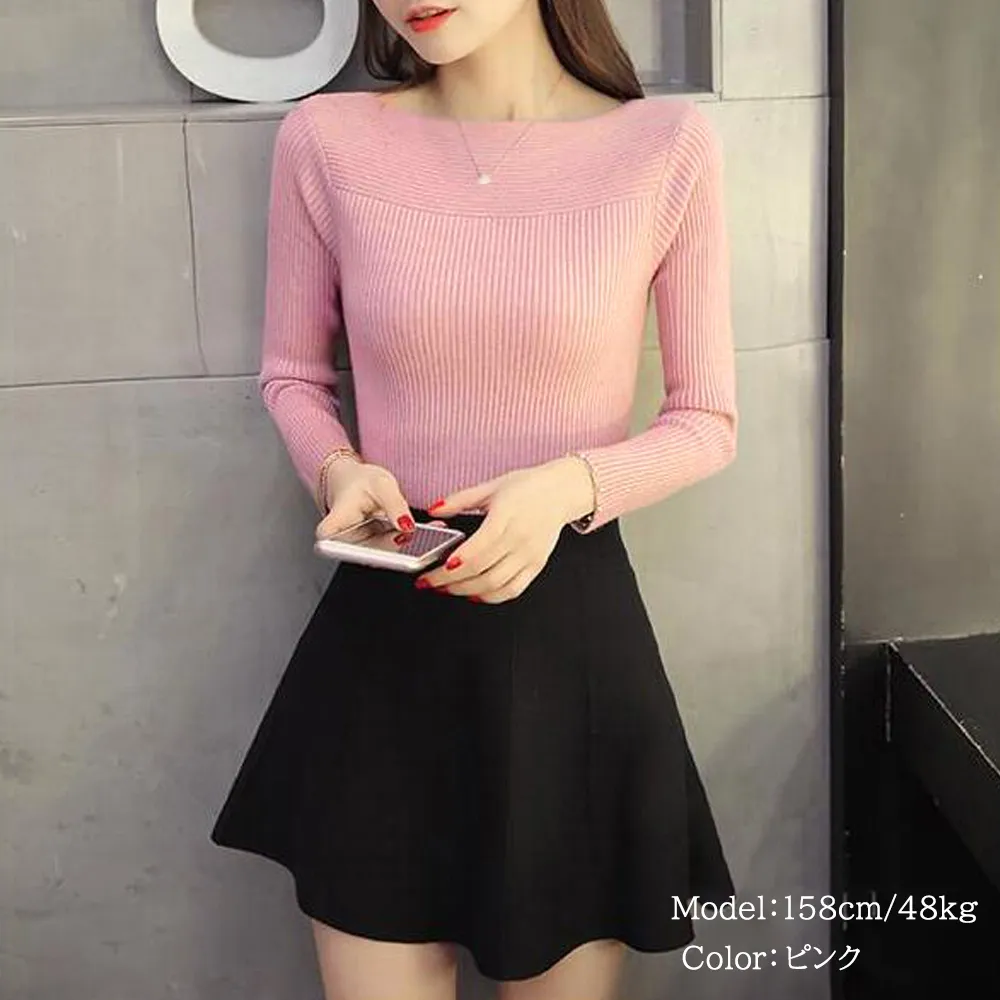 リブニットトップス ボートネック長袖 レディース着やせ 春秋OK オフィスカジュアル ホワイト/グレー/ブラック/ピンク/ブラウン