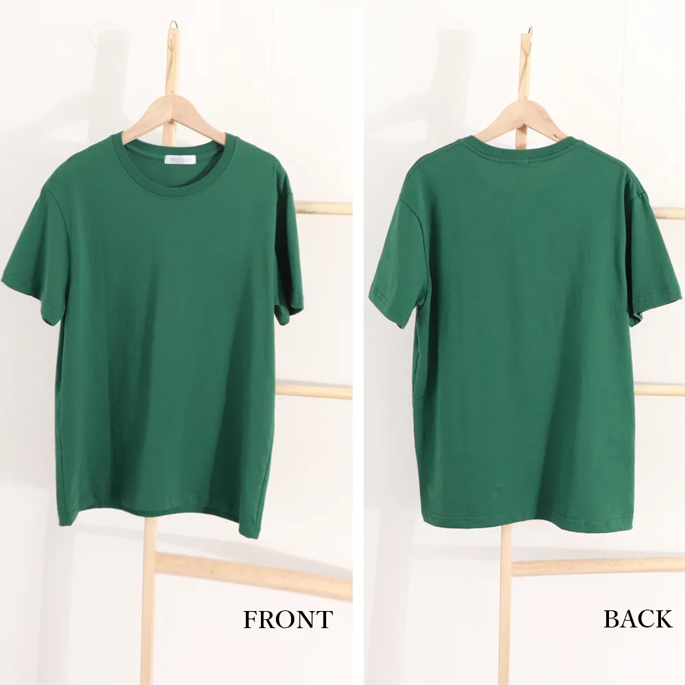 シンプルで誤魔化しが効かないので肌に優しい綿混生地とスタイリングで勝負するラウンドネックtシャツ