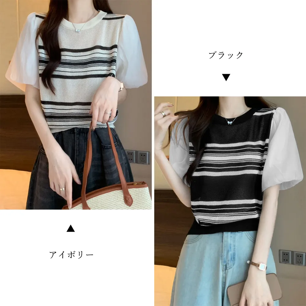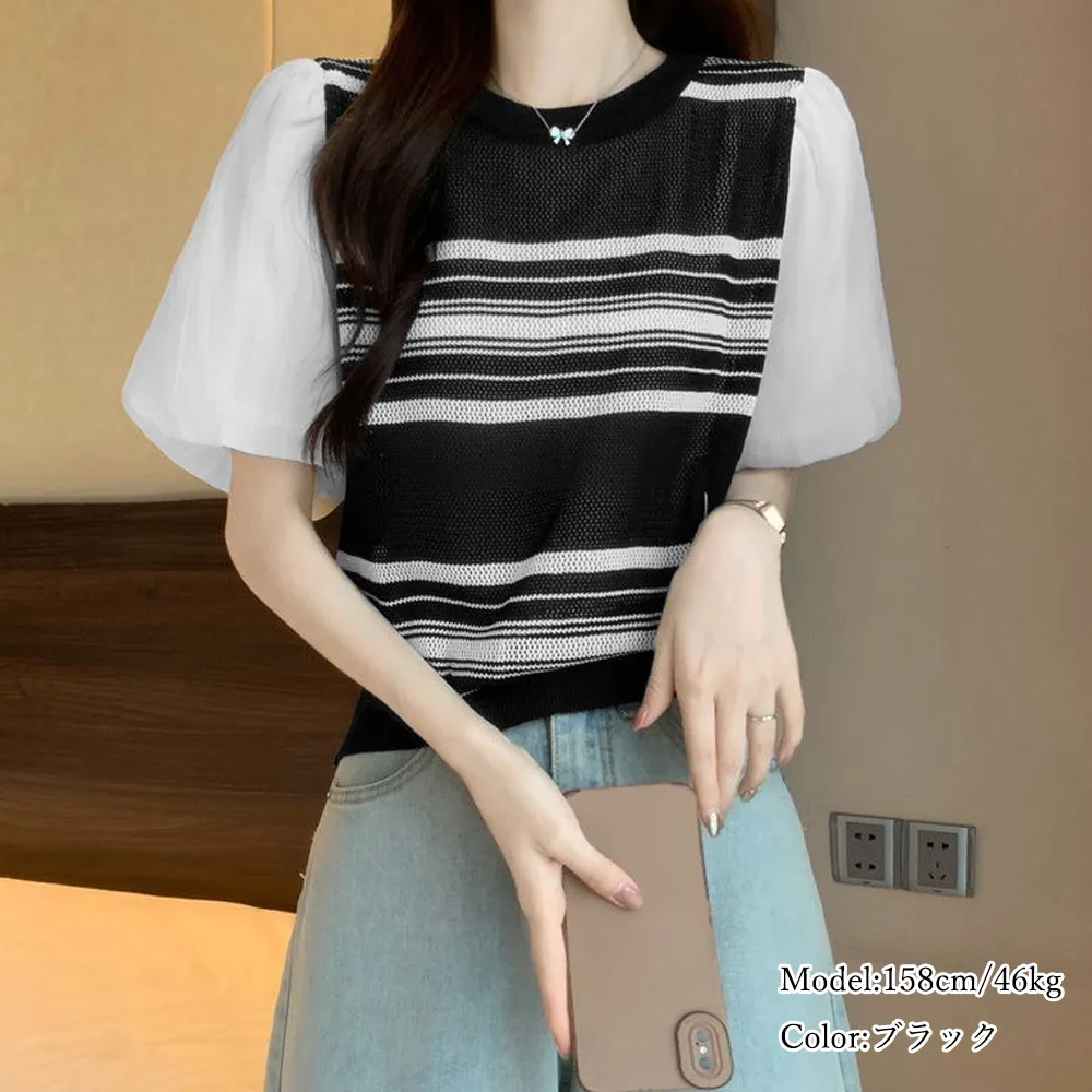 シフォン袖ニット夏 半袖ニットブラウス お洒落 ニットソー