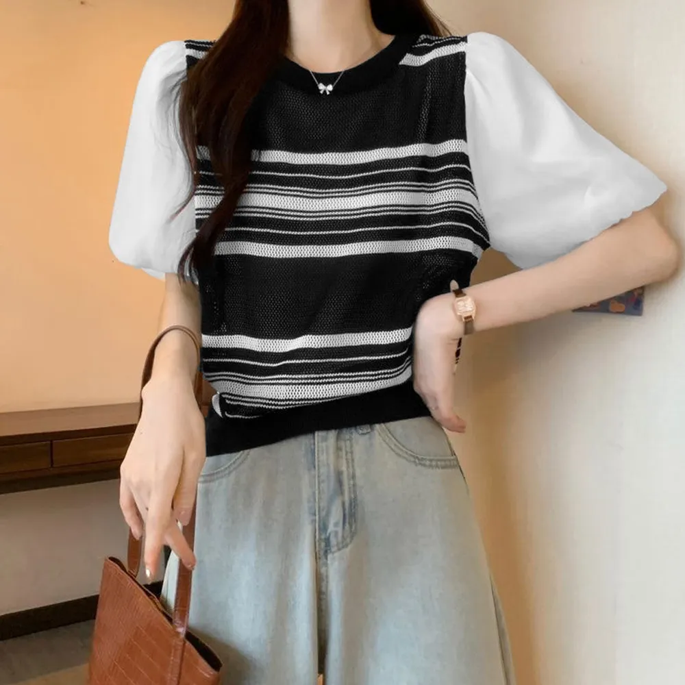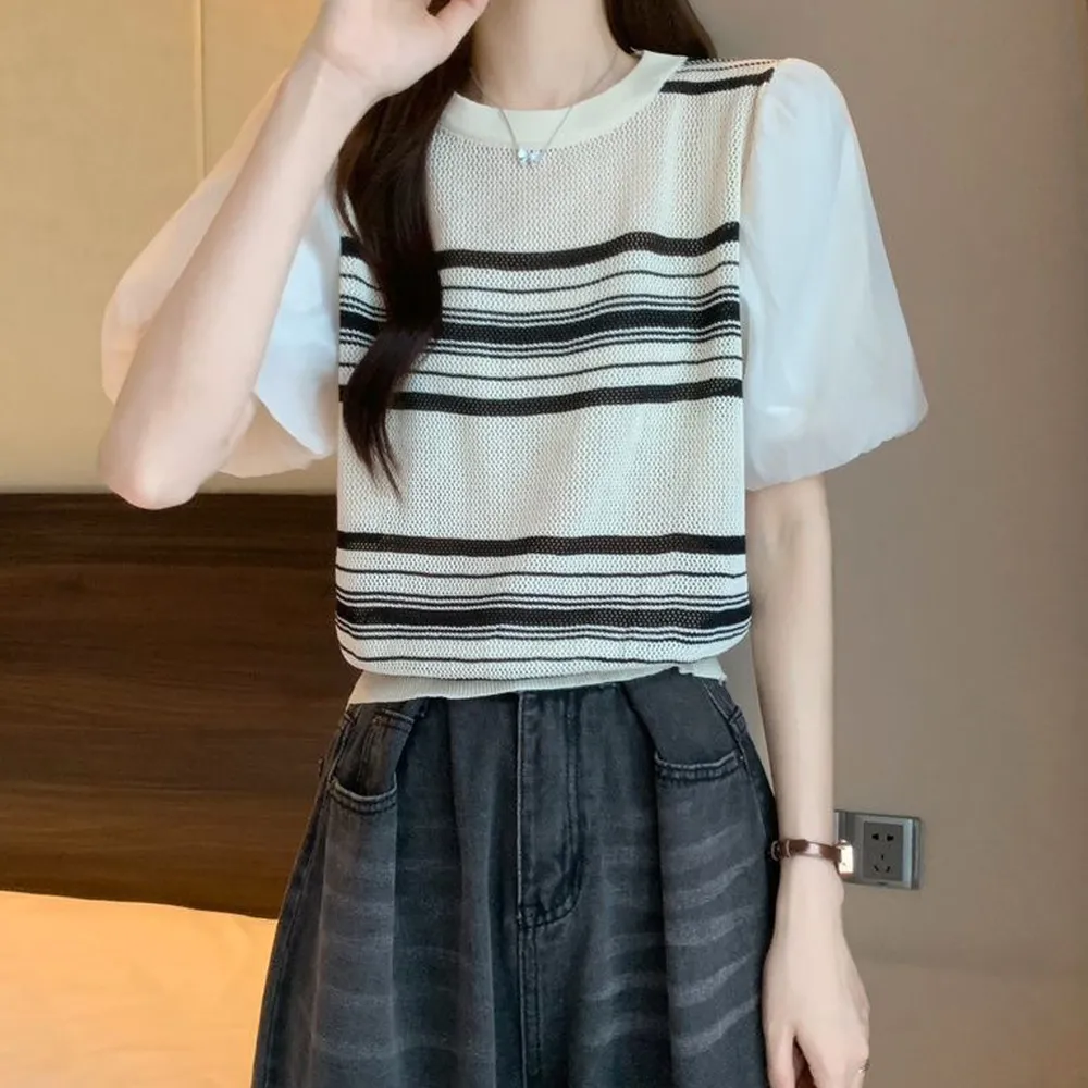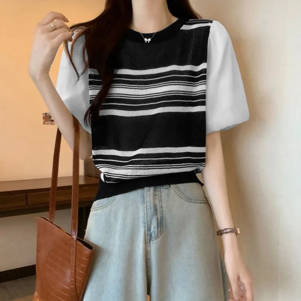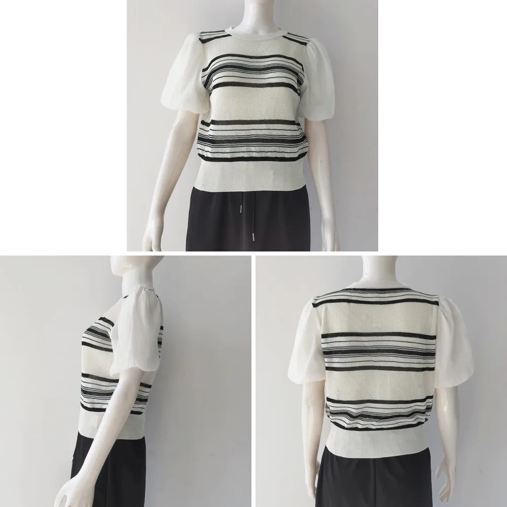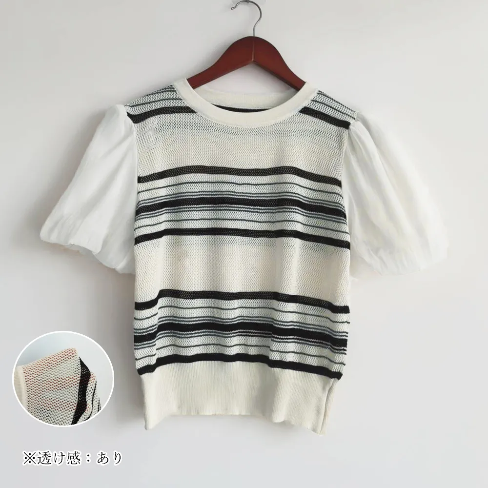 サマーニット異素材切り替えトップス|透け感シフォン袖と着やせ効果の夏向けオシャレニットソー