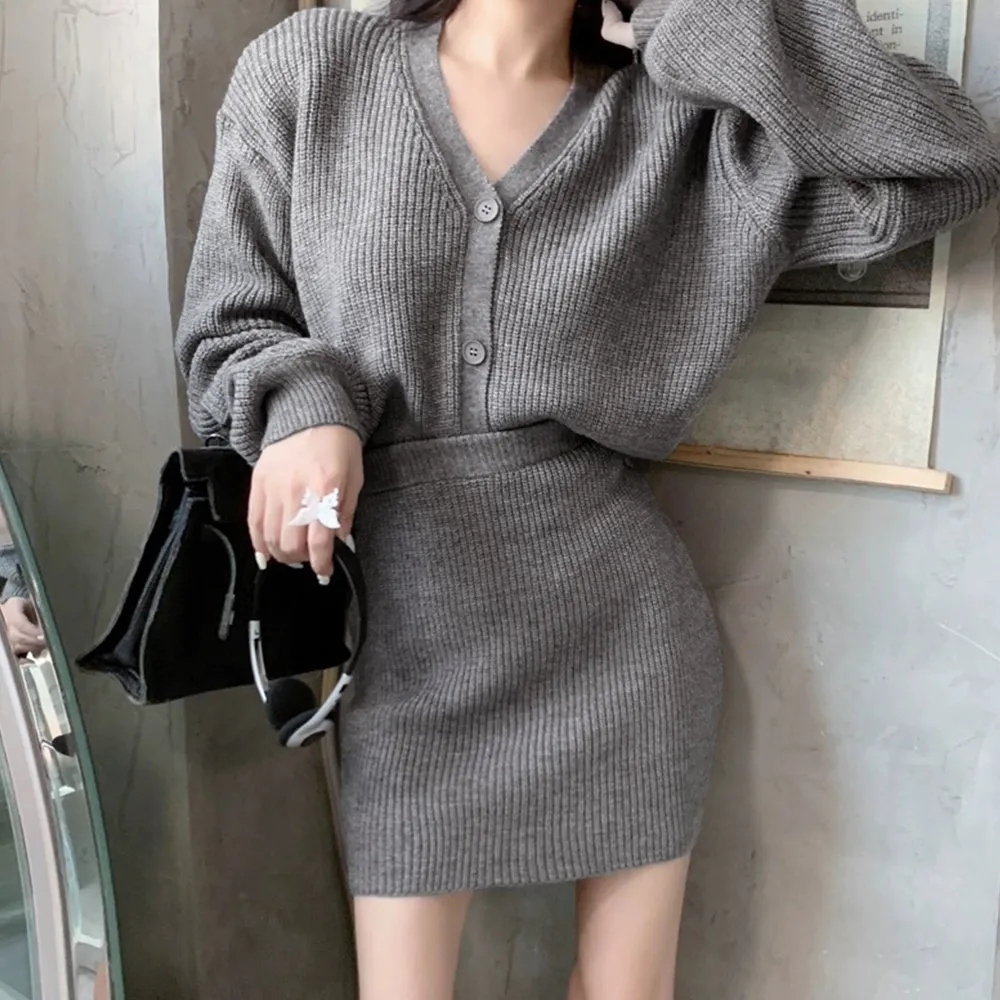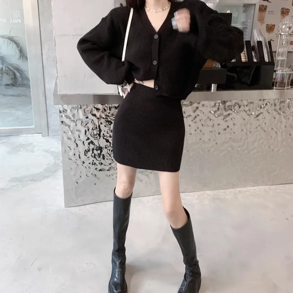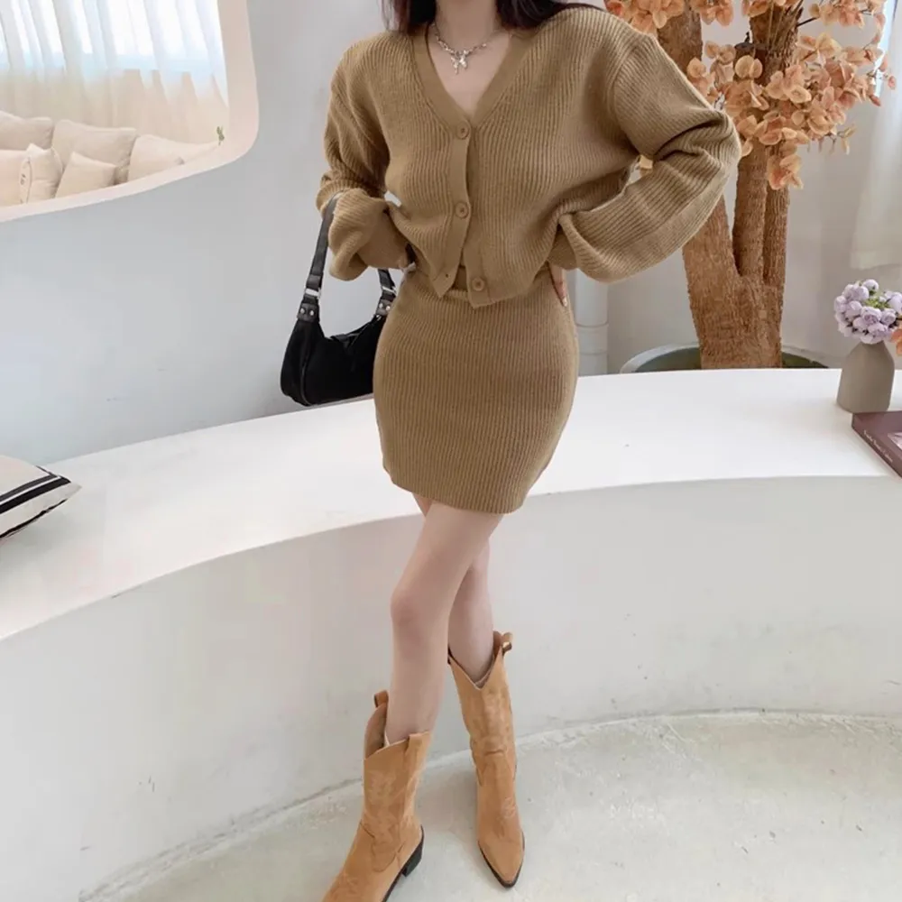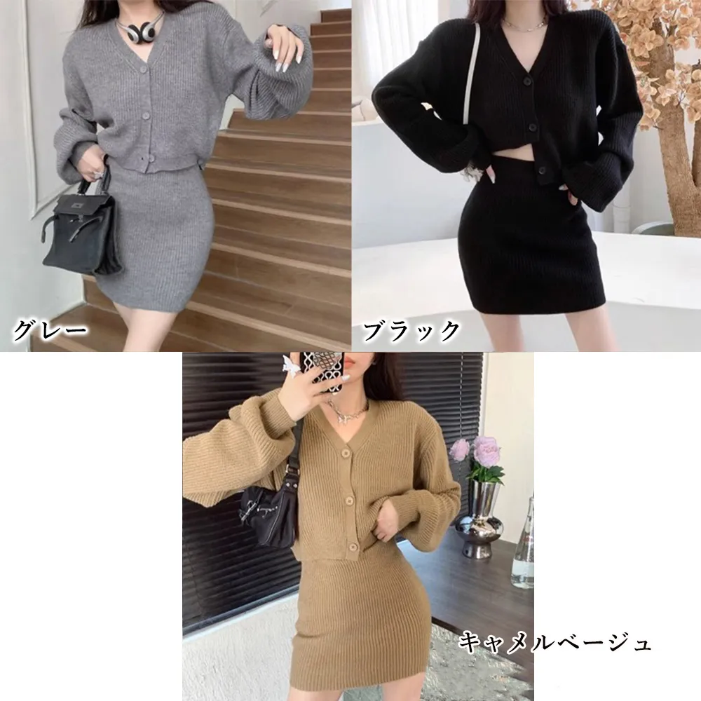 【秋冬韓国風ニットセットアップ】Vネックショートカーディガン&タイトスカート上下 | 着やせ効果でセクシー可愛いコーデ