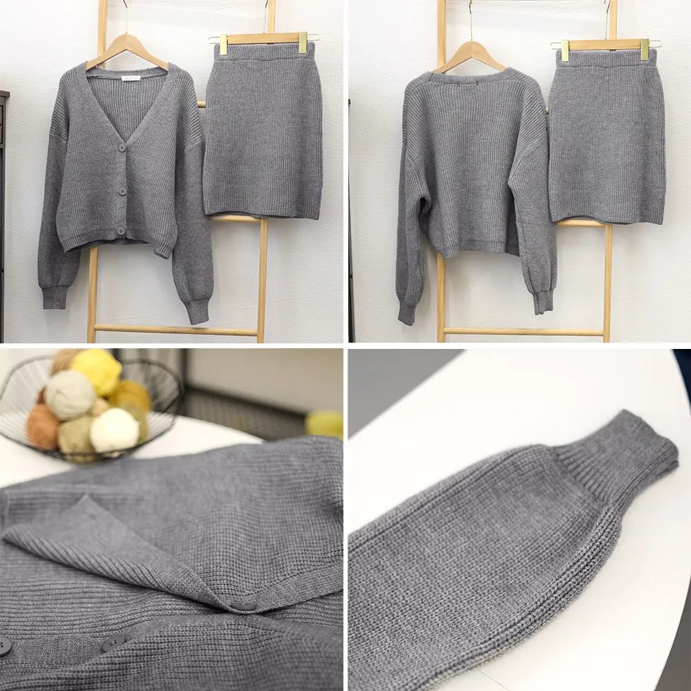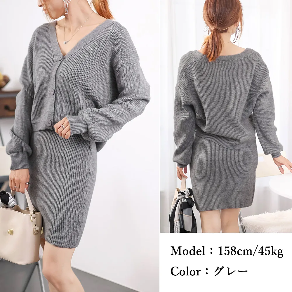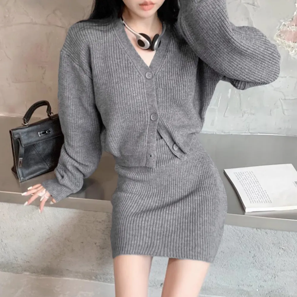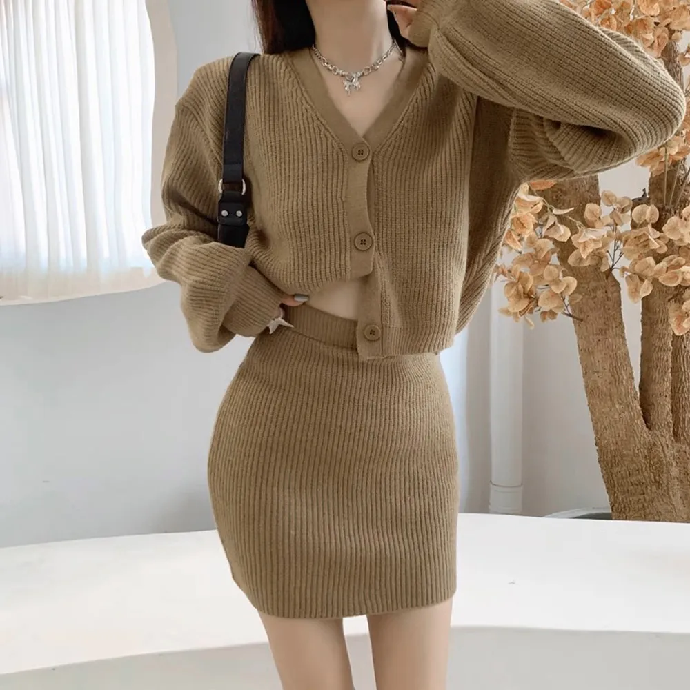 【秋冬韓国風ニットセットアップ】Vネックショートカーディガン&タイトスカート上下 | 着やせ効果でセクシー可愛いコーデ
