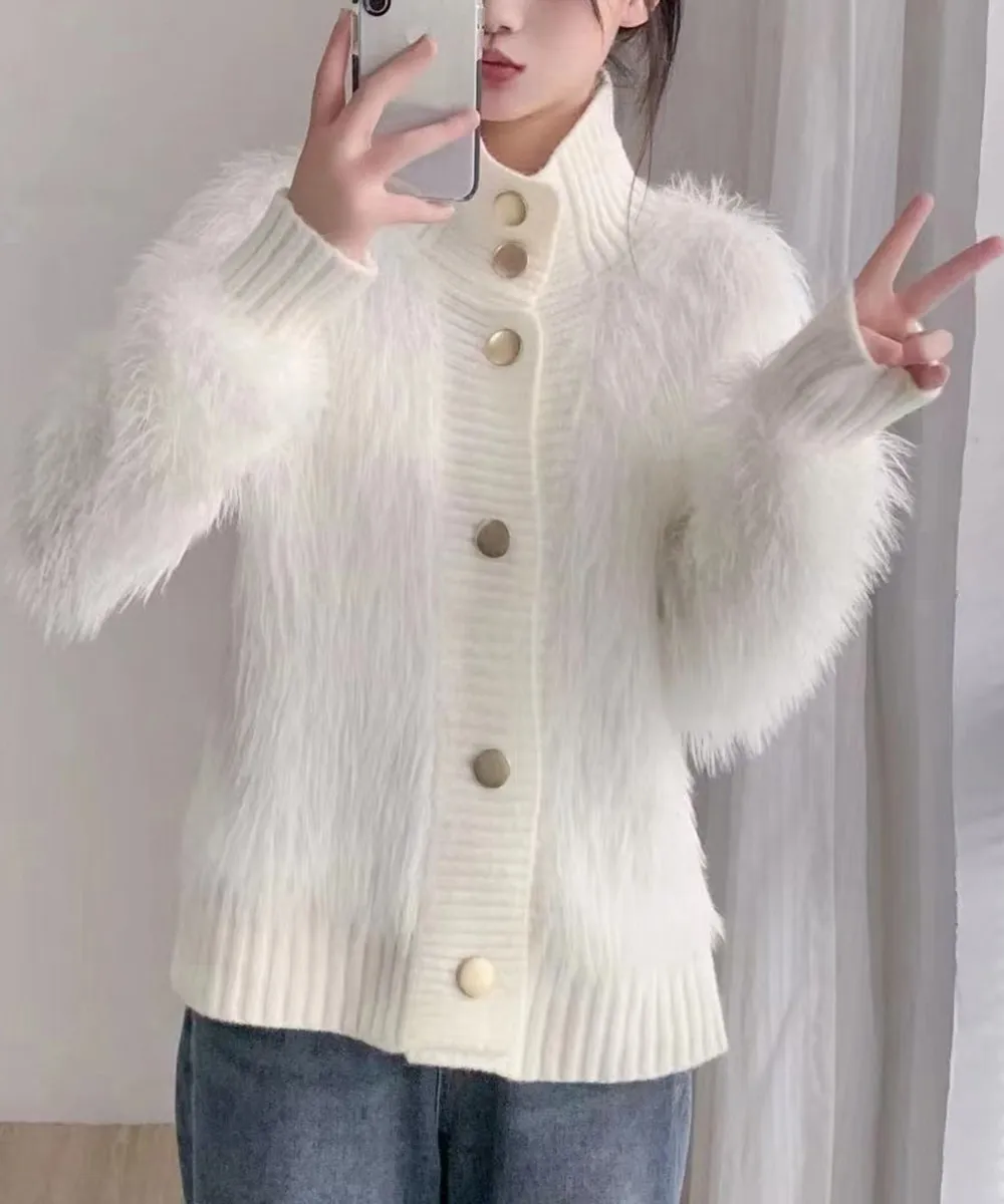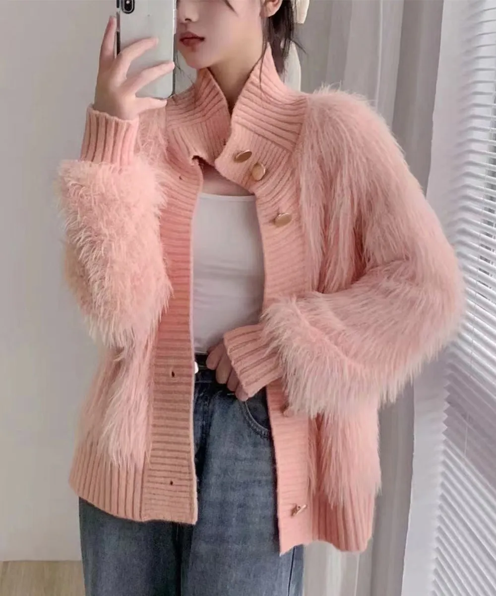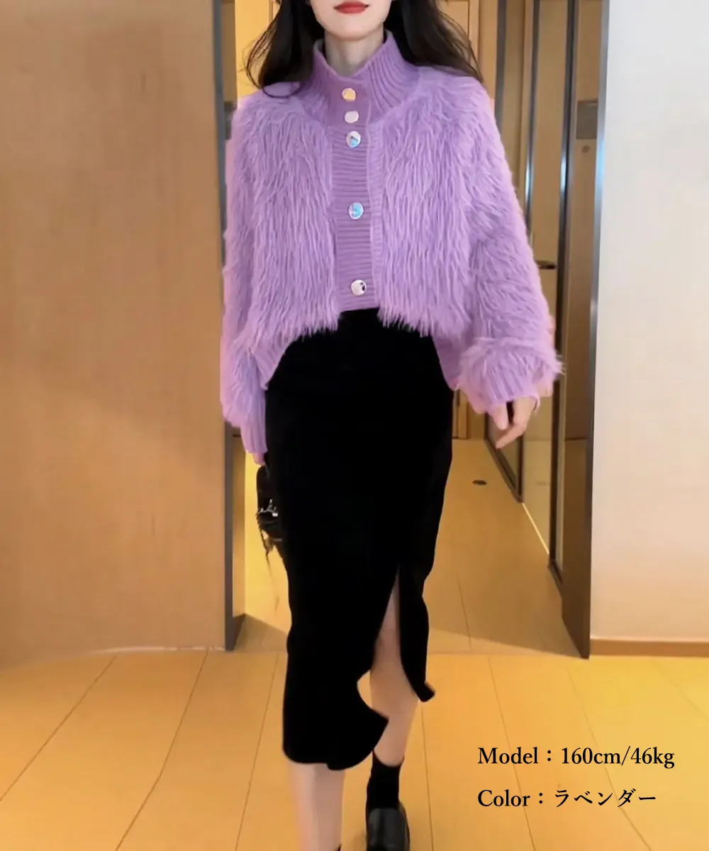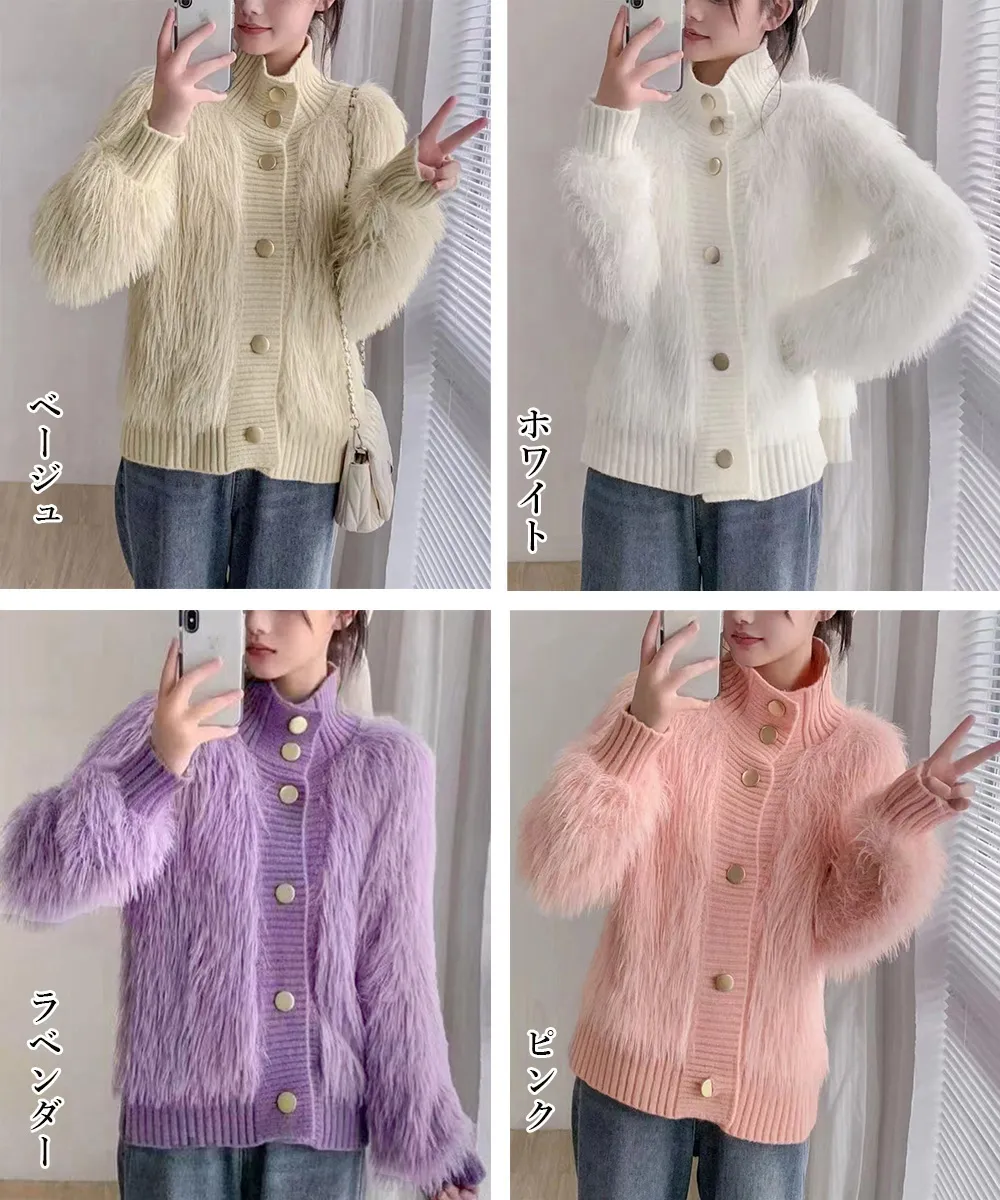 ふわふわ韓国風ファーカーディガン スタンドカラー レディース秋冬暖かいシャギーニットアウター 着やせ体型カバー