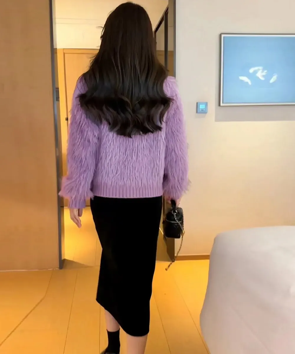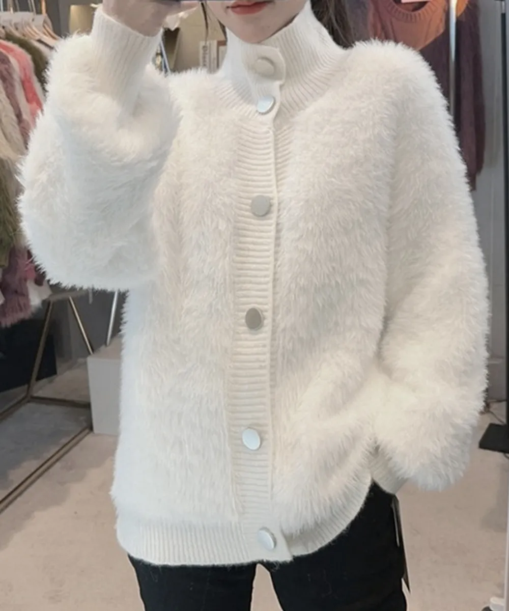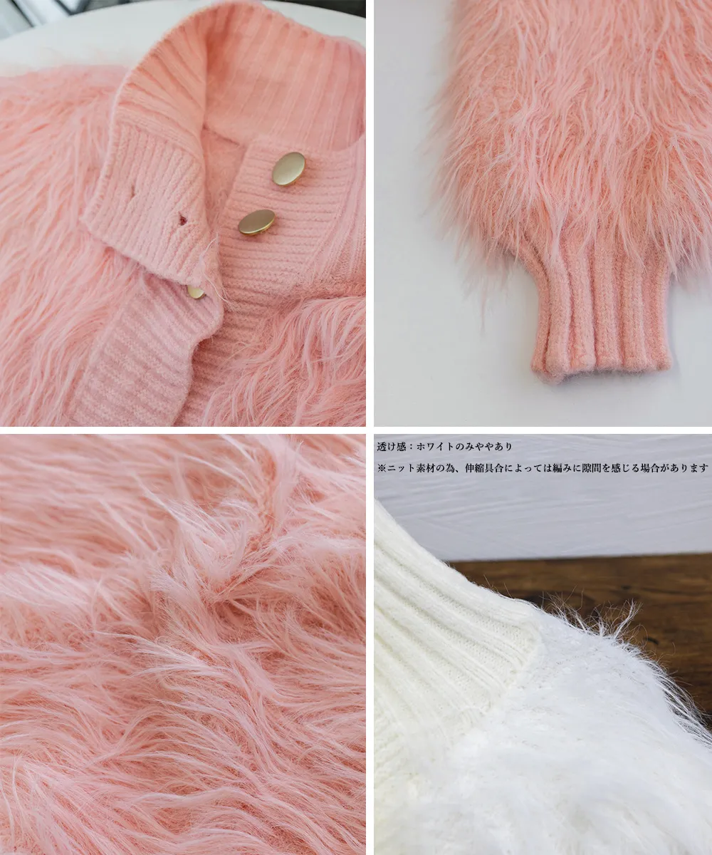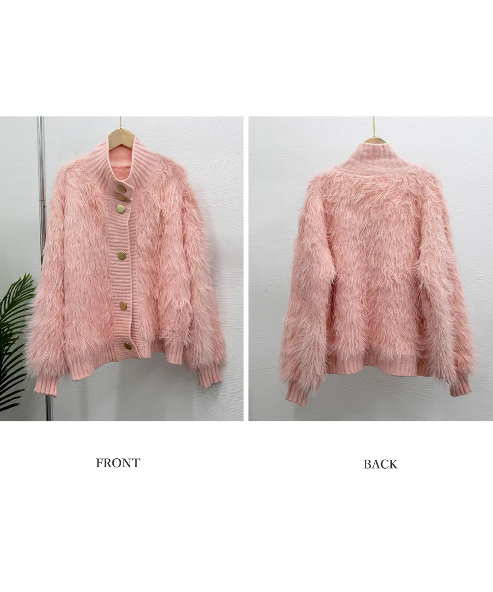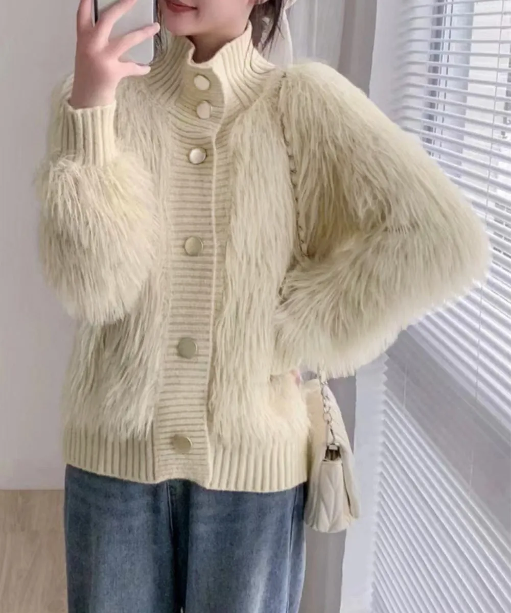 ふわふわ韓国風ファーカーディガン スタンドカラー レディース秋冬暖かいシャギーニットアウター 着やせ体型カバー