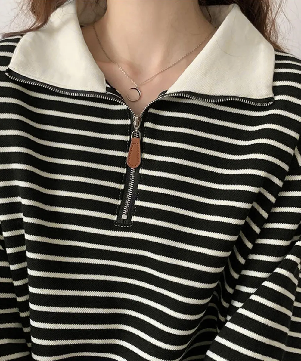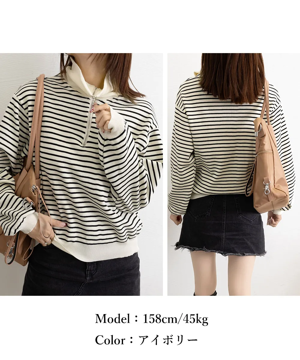 ハーフジップニットポロ ボーダートップス|体型カバー&大人可愛い 長袖ニットトレーナー 綿85%