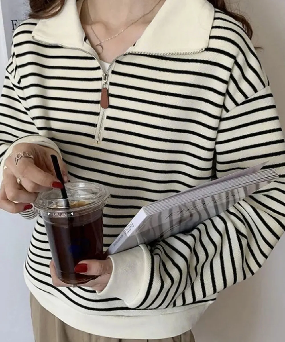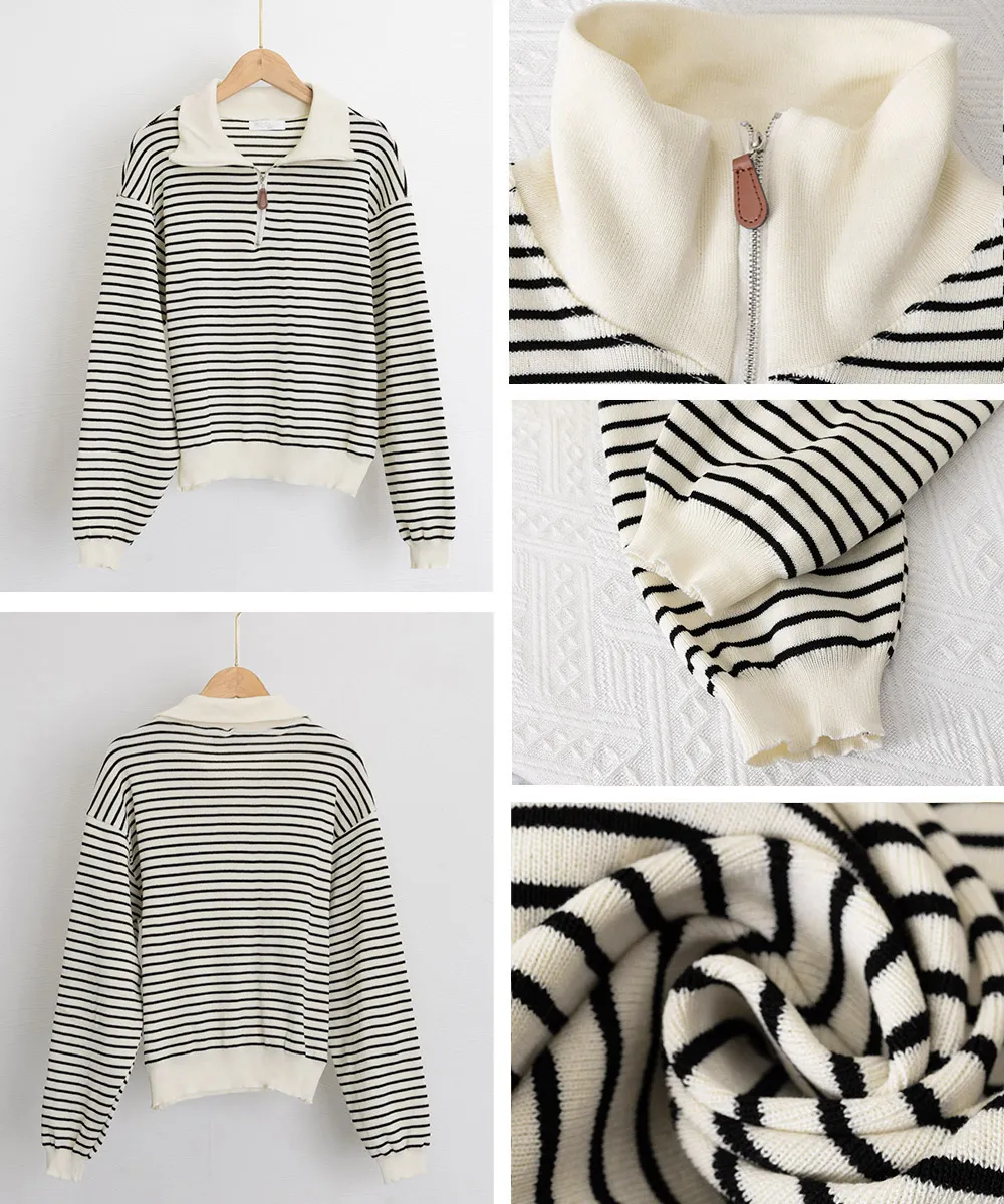 シンプルでありながら洗練された雰囲気を持つボーダー柄ポロカラーニットトレーナーが新登場