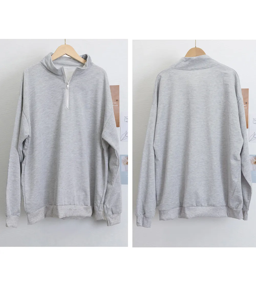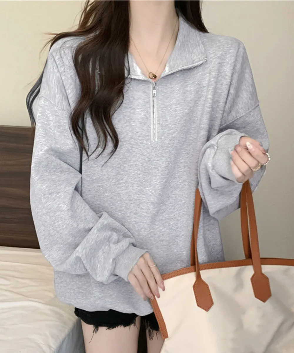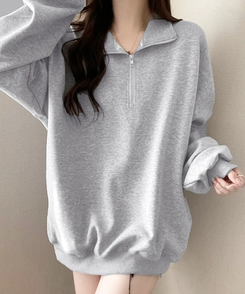 ハーフジップスウェットシャツ 春秋薄手 ハイネック長袖トレーナー ゆったり体型カバーアイテム 韓国風カジュアル ルームウェア・通学にも