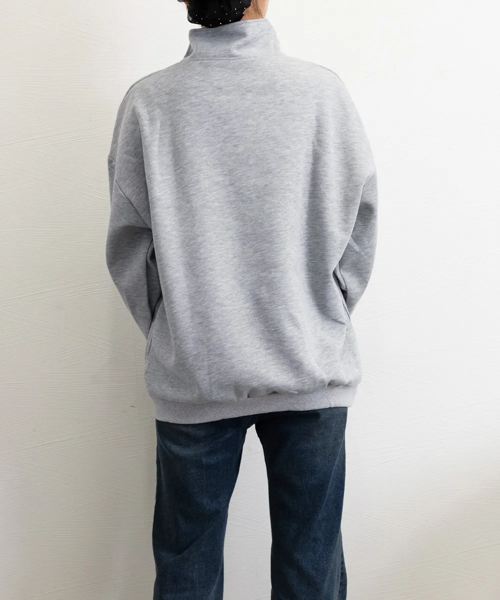 ハーフジップがアクセント、首元の開け閉めで、抜け感のあるコーデから防寒対策まで自在に対応