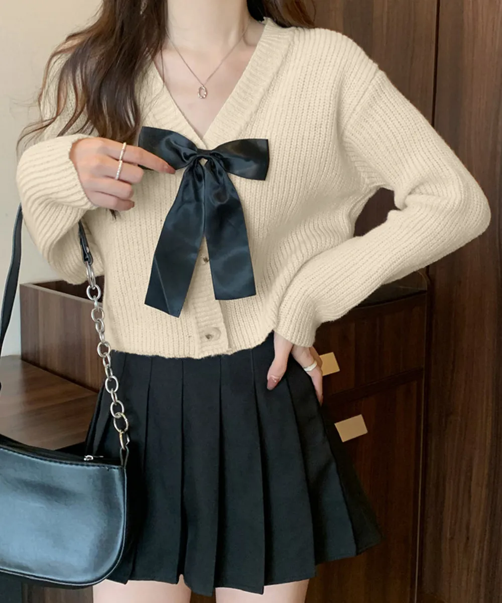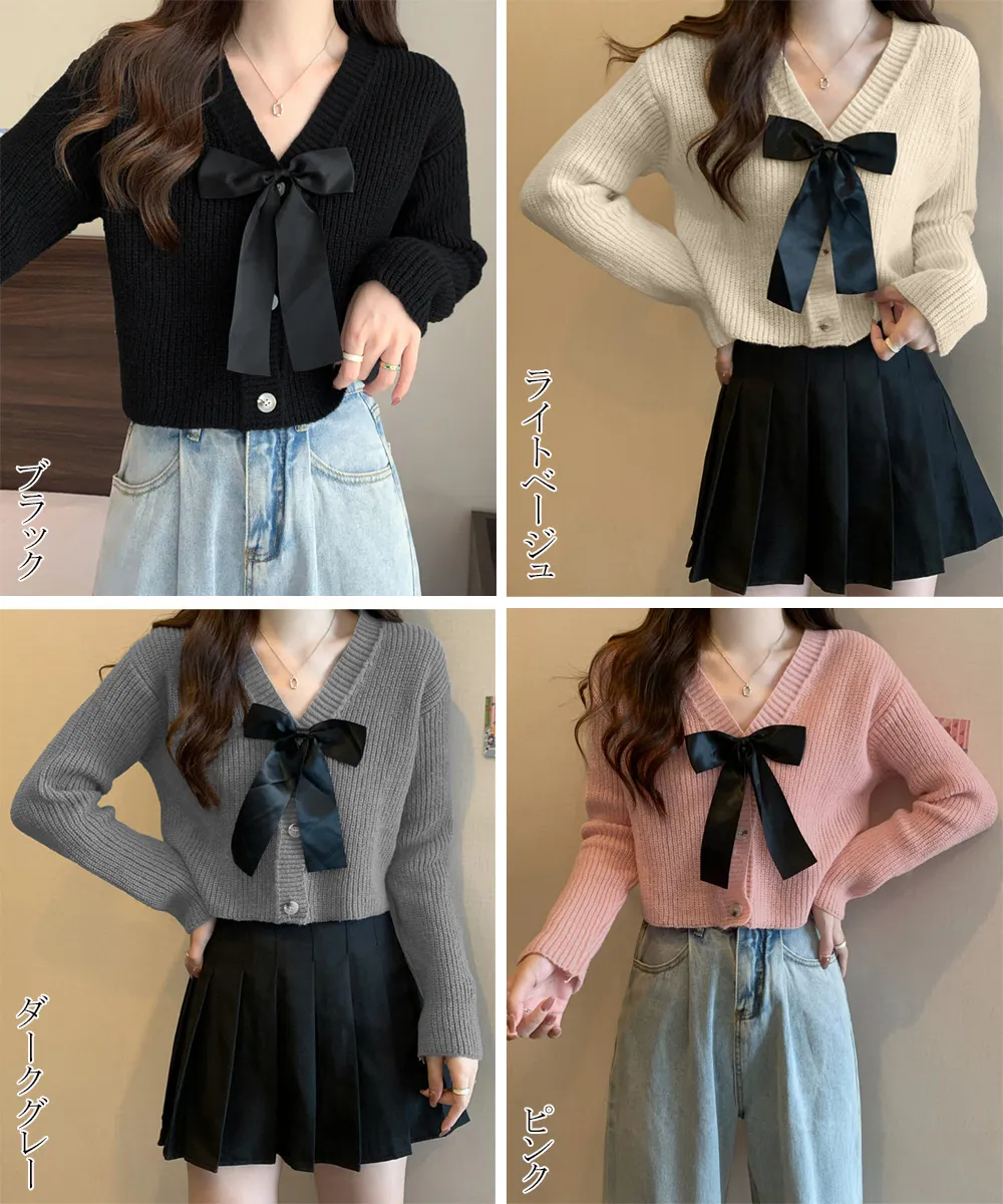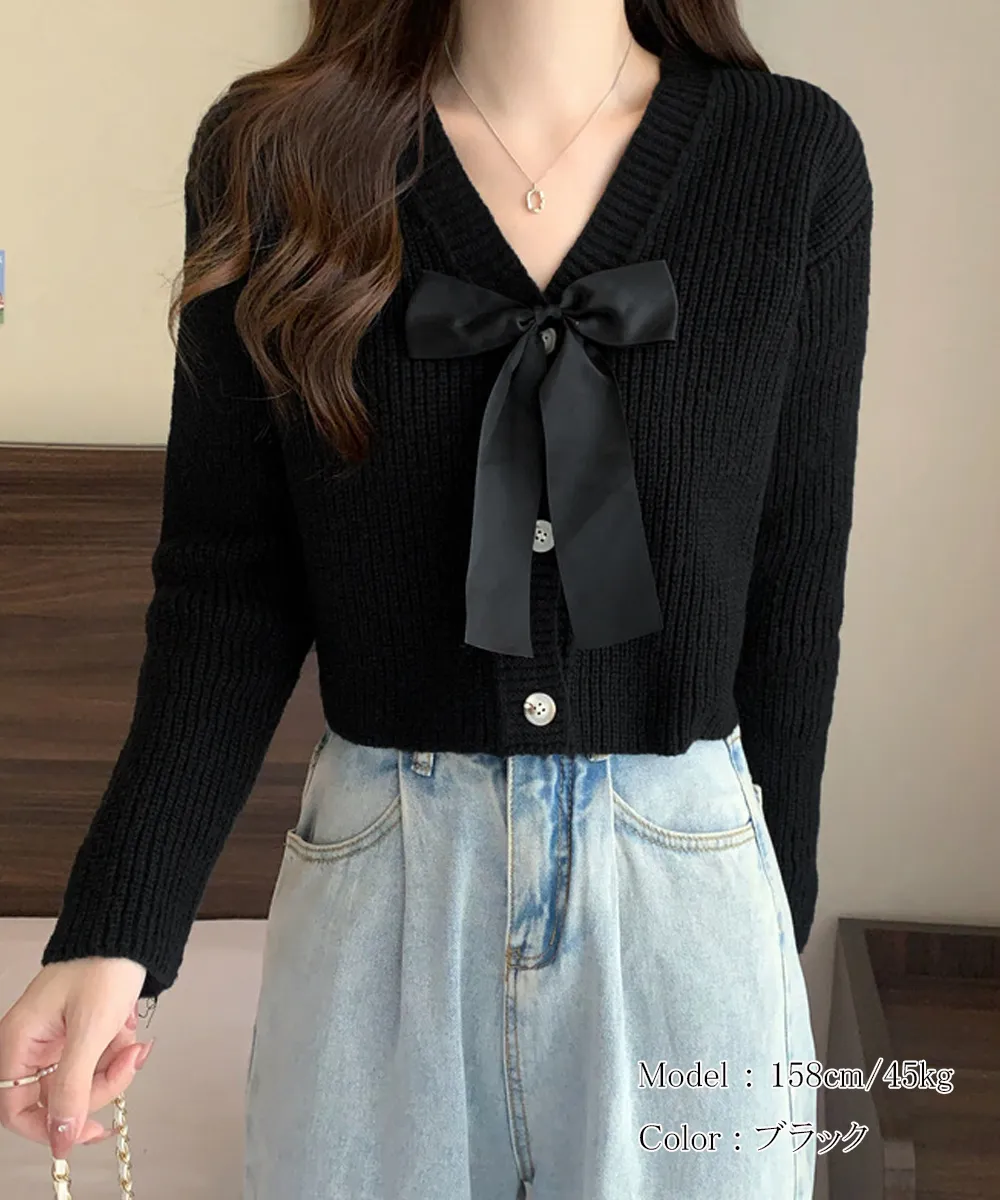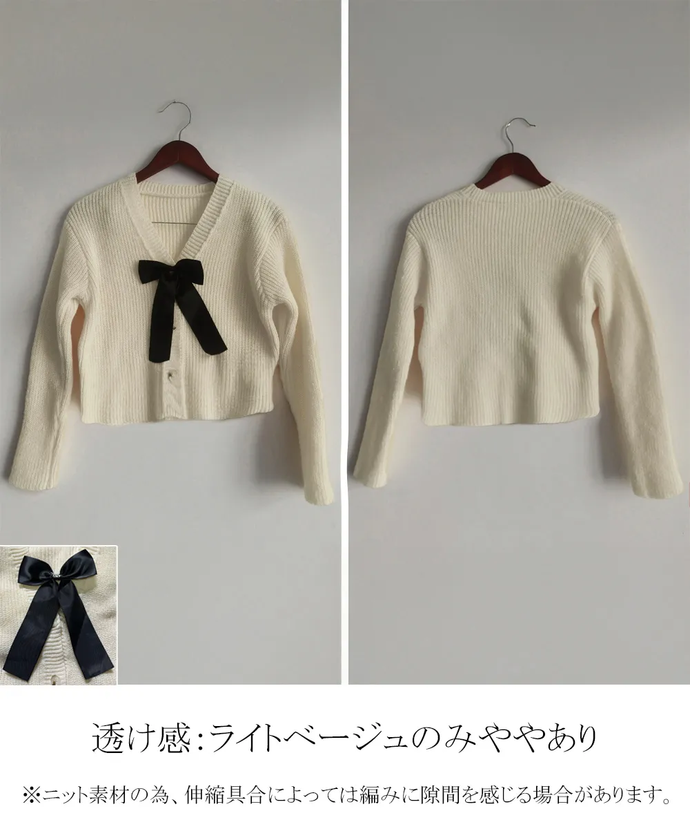 ニットカーディガン リボン付 秋冬羽織り レディース Vネック ショート丈 長袖 アウター 無地 可愛い 上品 ワンピースとしても