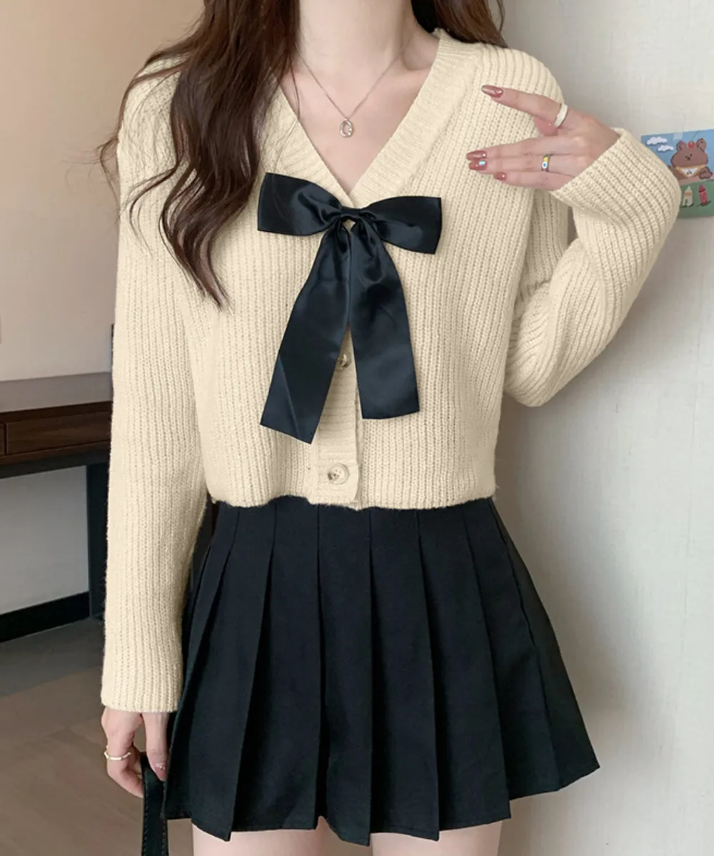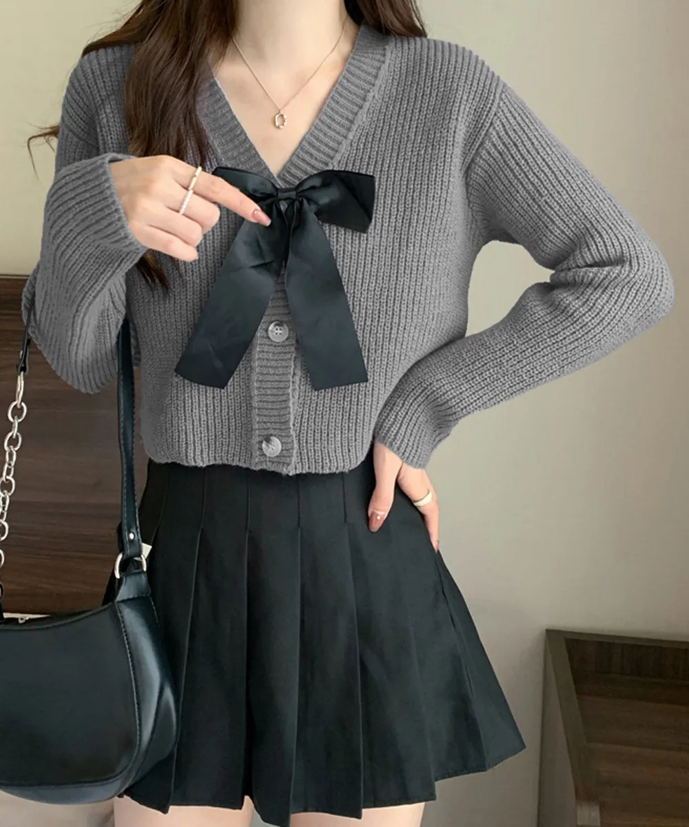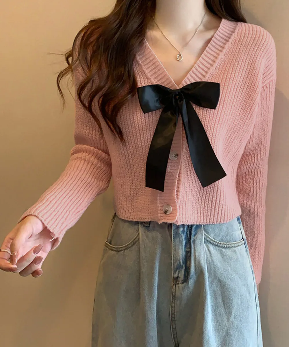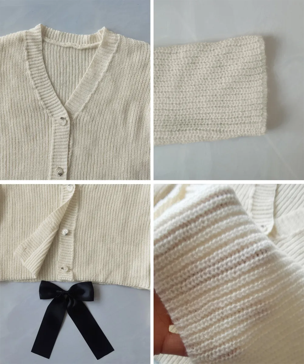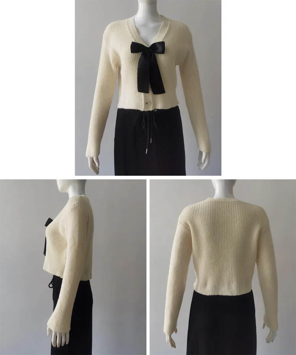 ニットカーディガン リボン付 秋冬羽織り レディース Vネック ショート丈 長袖 アウター 無地 可愛い 上品 ワンピースとしても