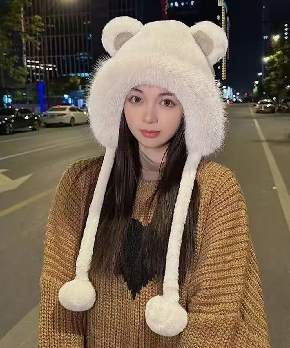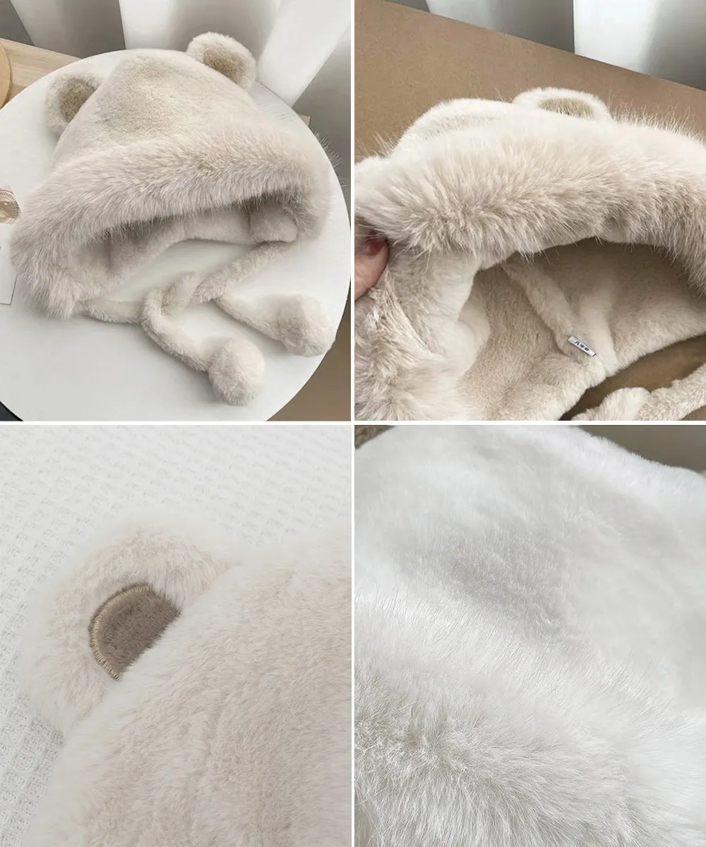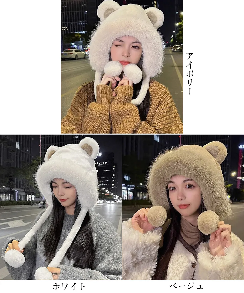 レディースファー帽子 クマ耳デザイン 暖かい防寒帽 アイボリー/ホワイト/ベージュ ワンサイズ 小顔効果もふもふポンポン付き