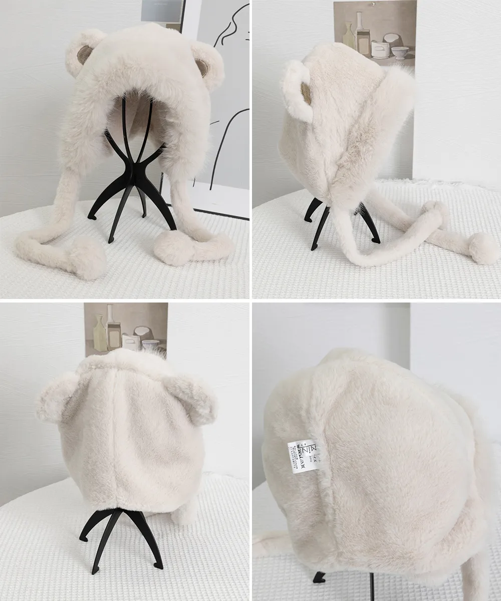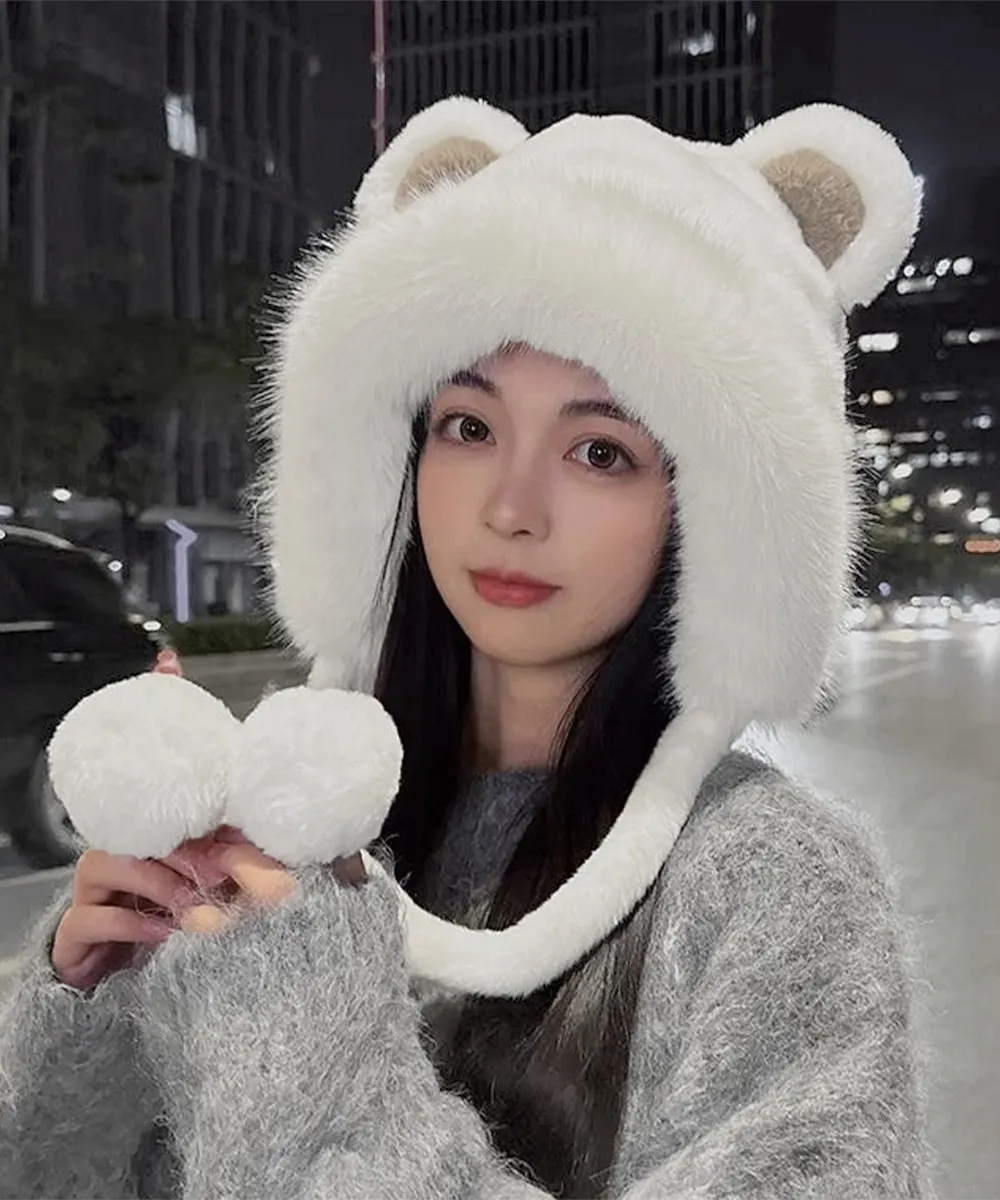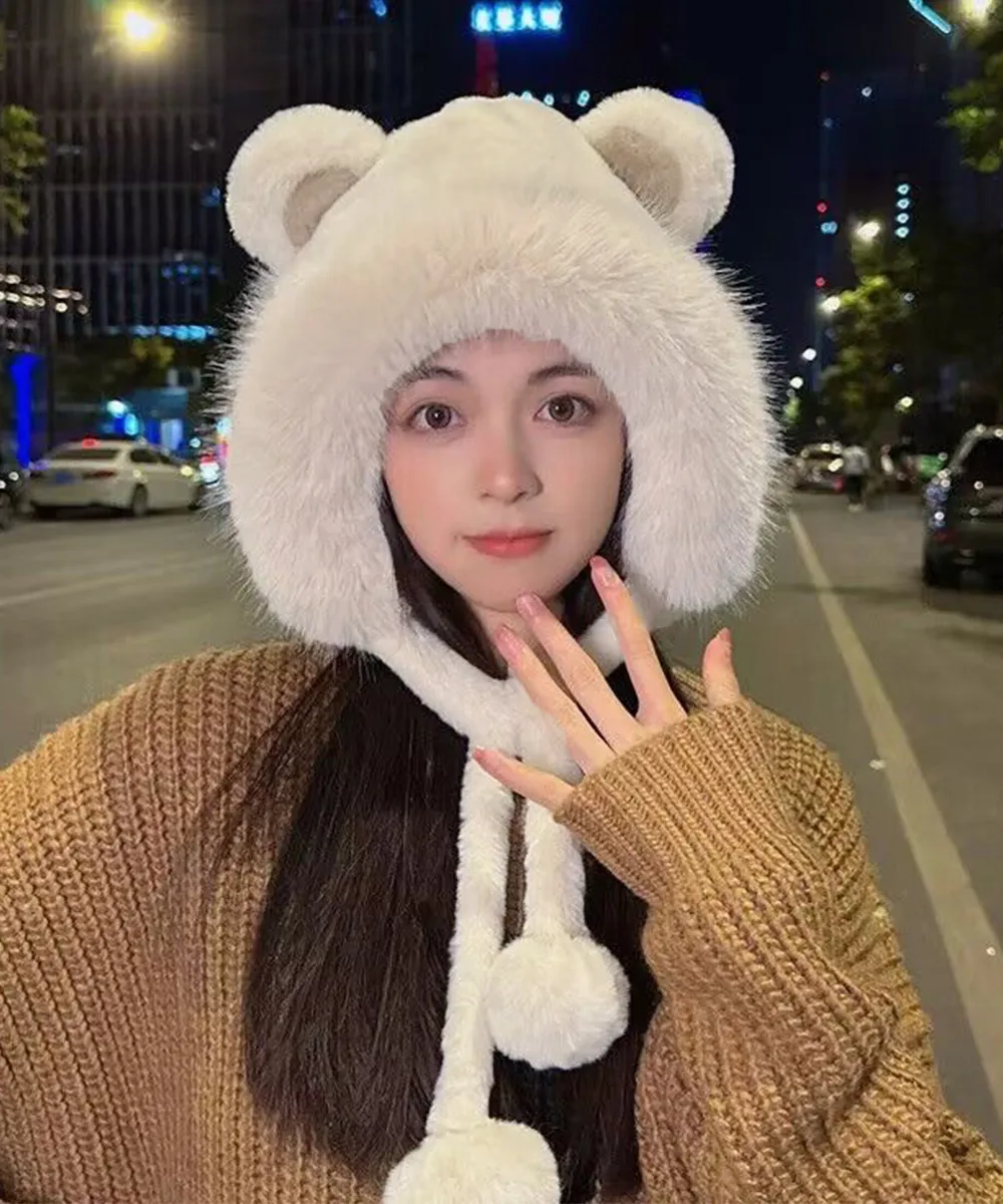 レディースファー帽子 クマ耳デザイン 暖かい防寒帽 アイボリー/ホワイト/ベージュ ワンサイズ 小顔効果もふもふポンポン付き