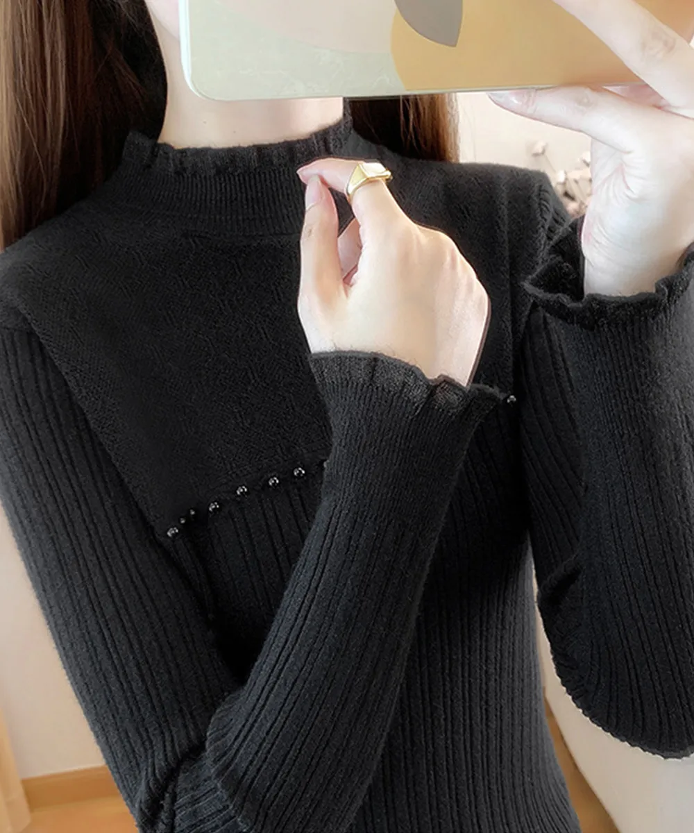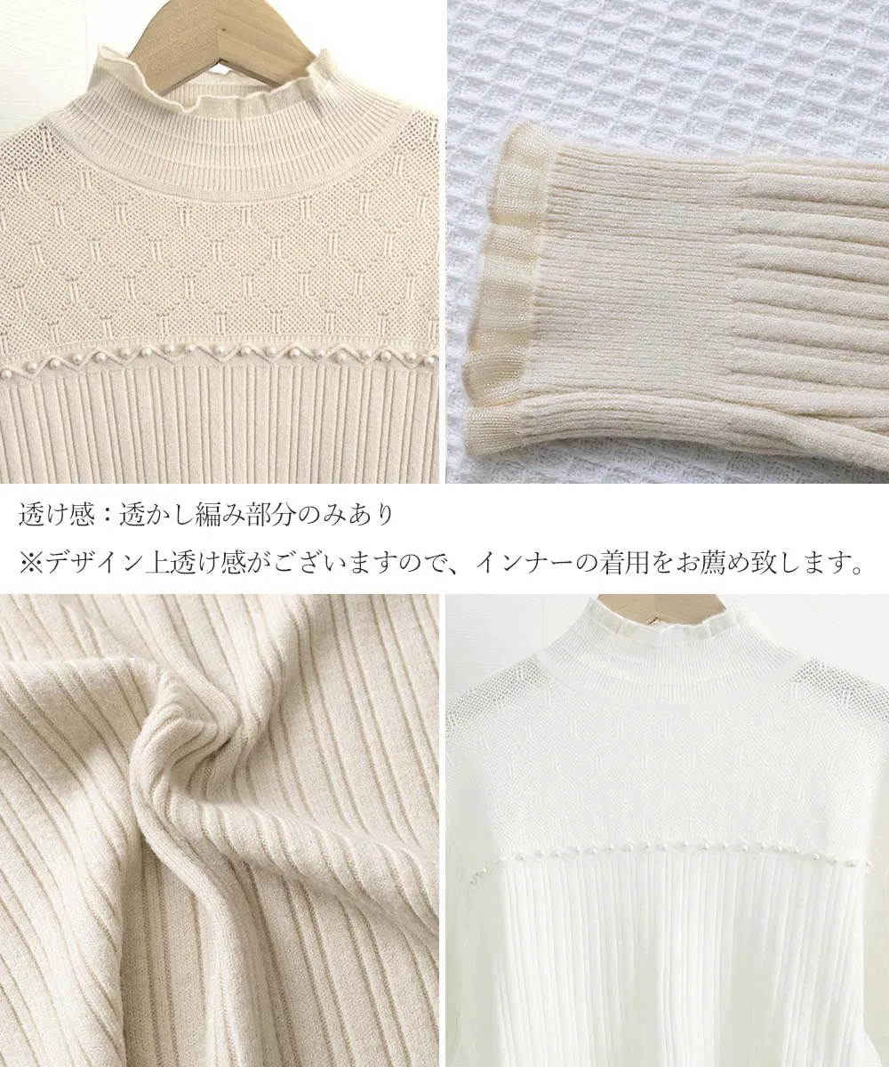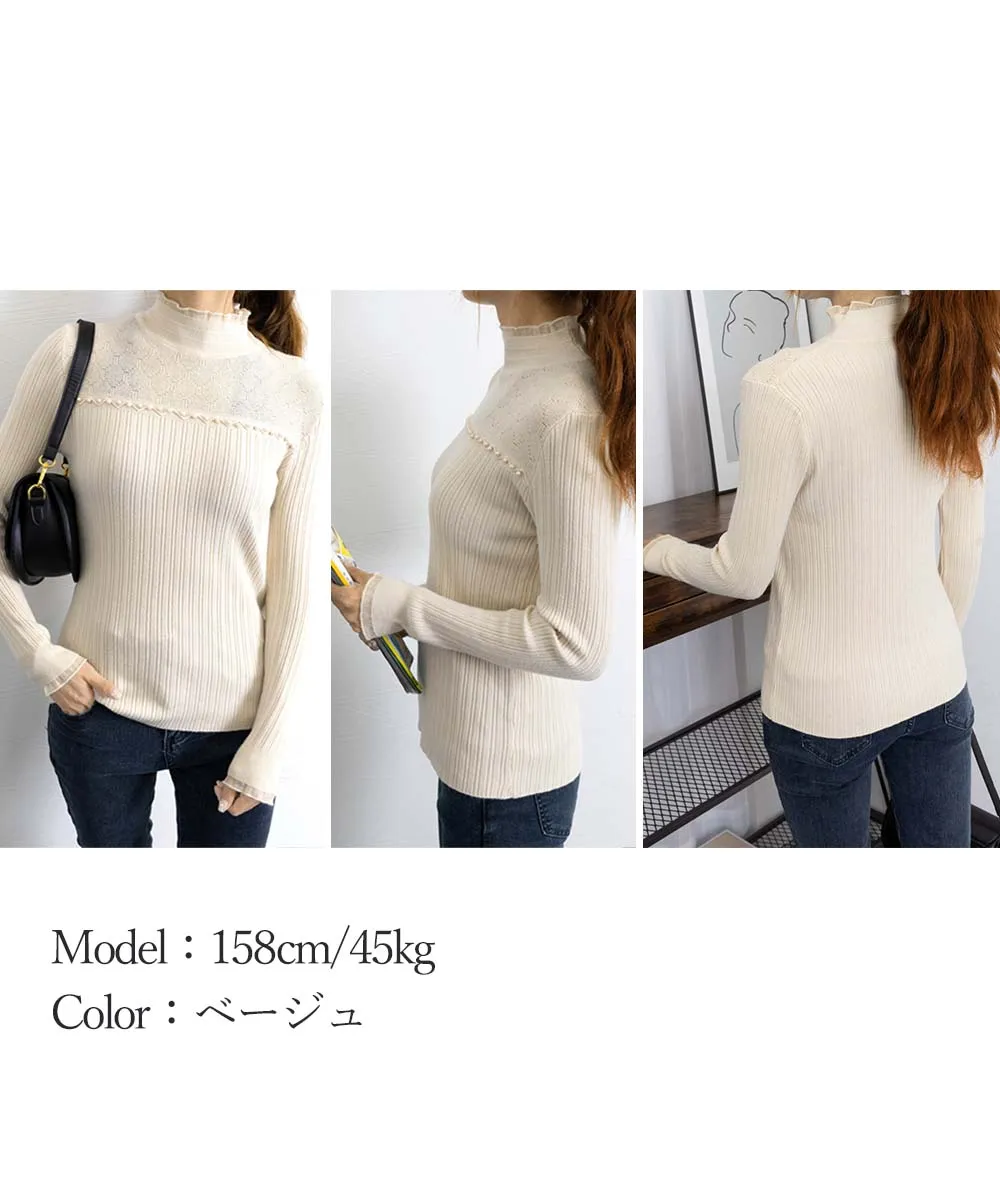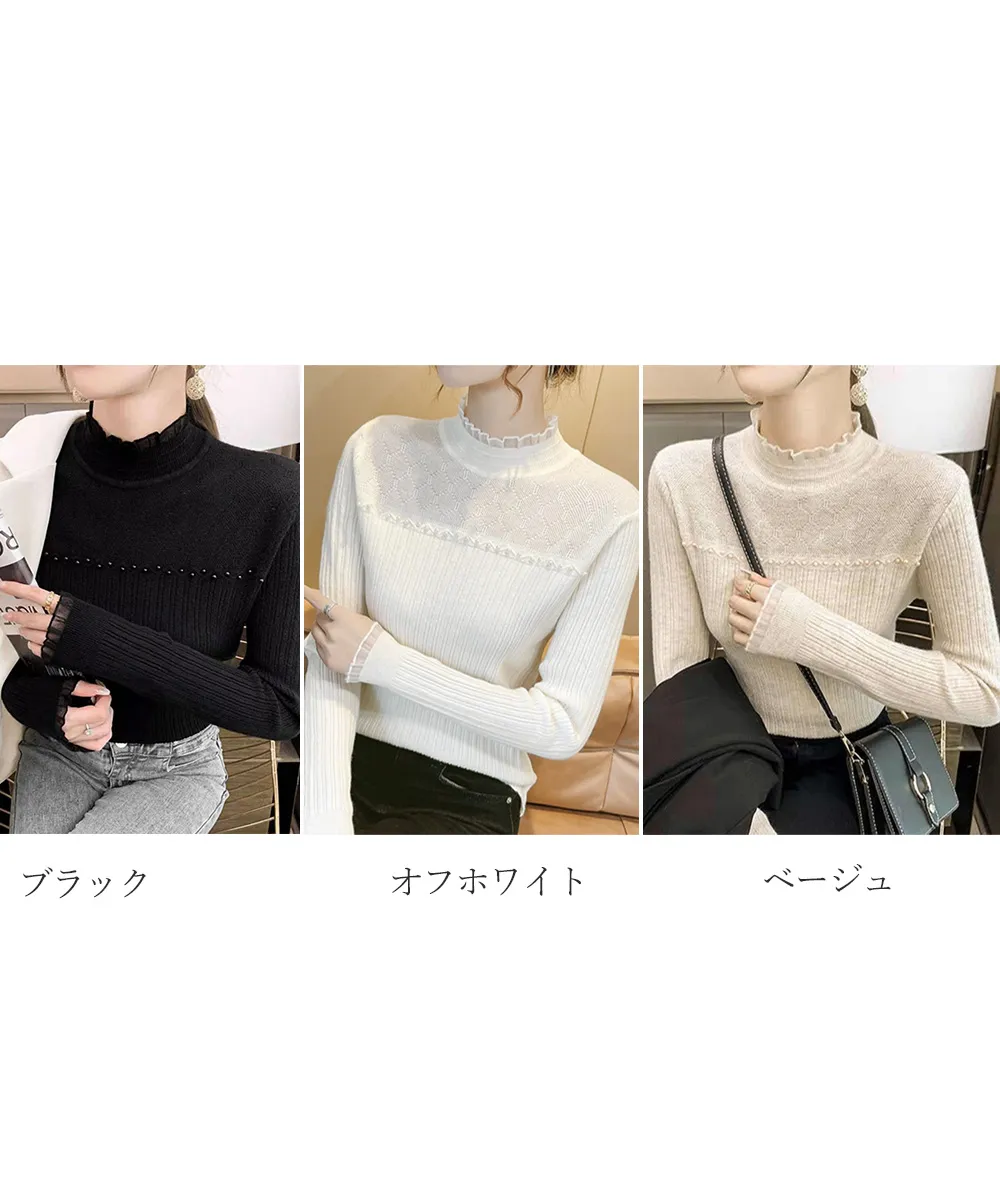 大人可愛いハイネックニットトップス パール&レースフリルで着回しOK | セーターレディース