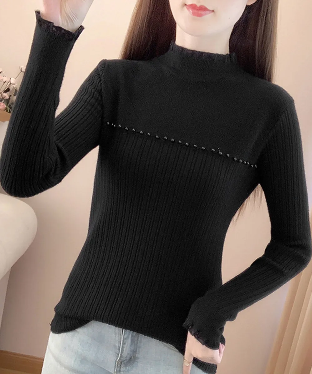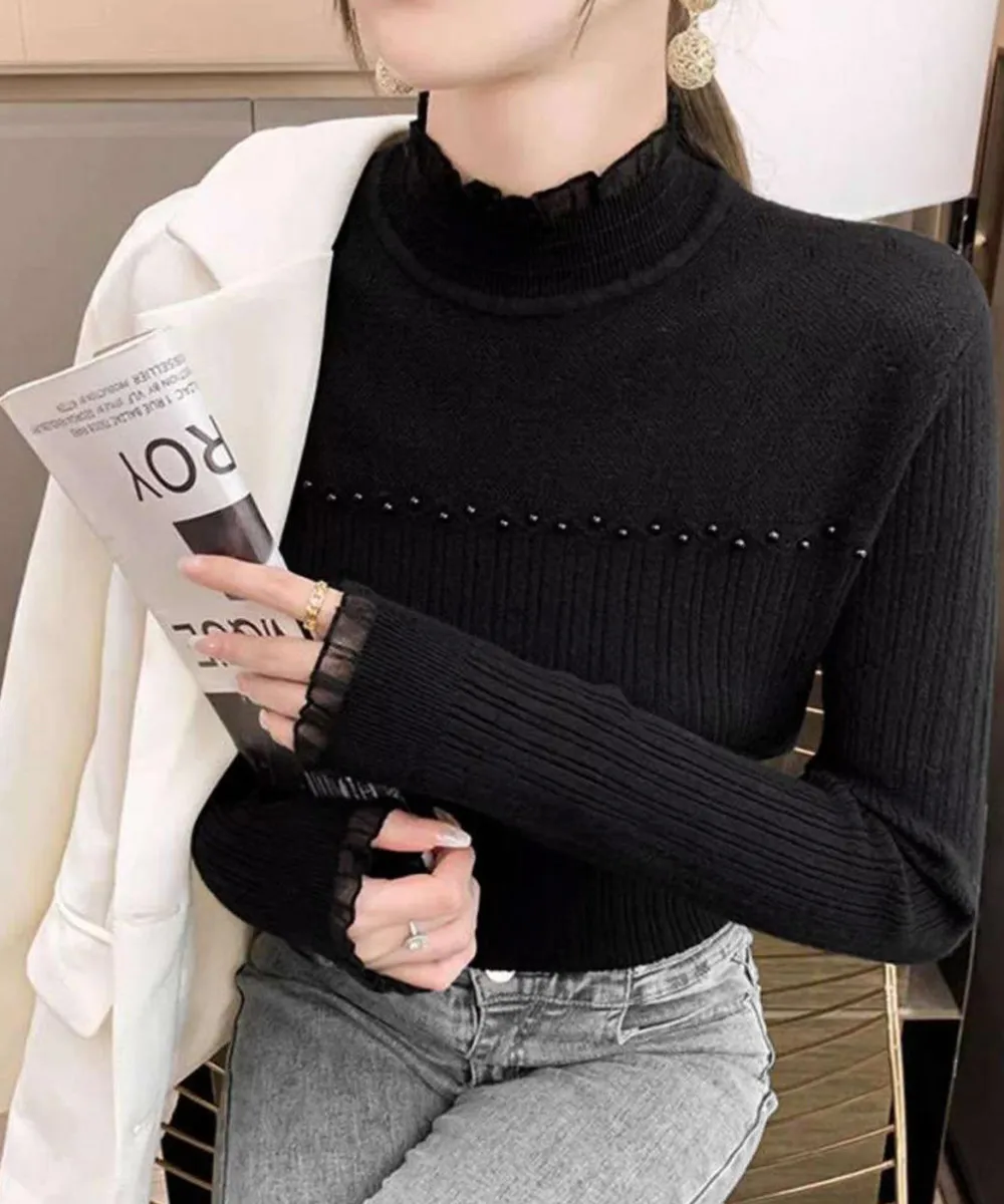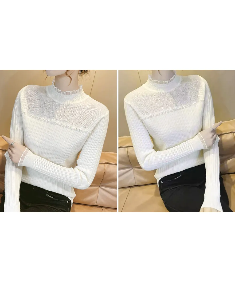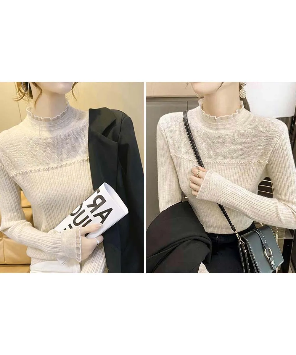 大人可愛いハイネックニットトップス パール&レースフリルで着回しOK | セーターレディース