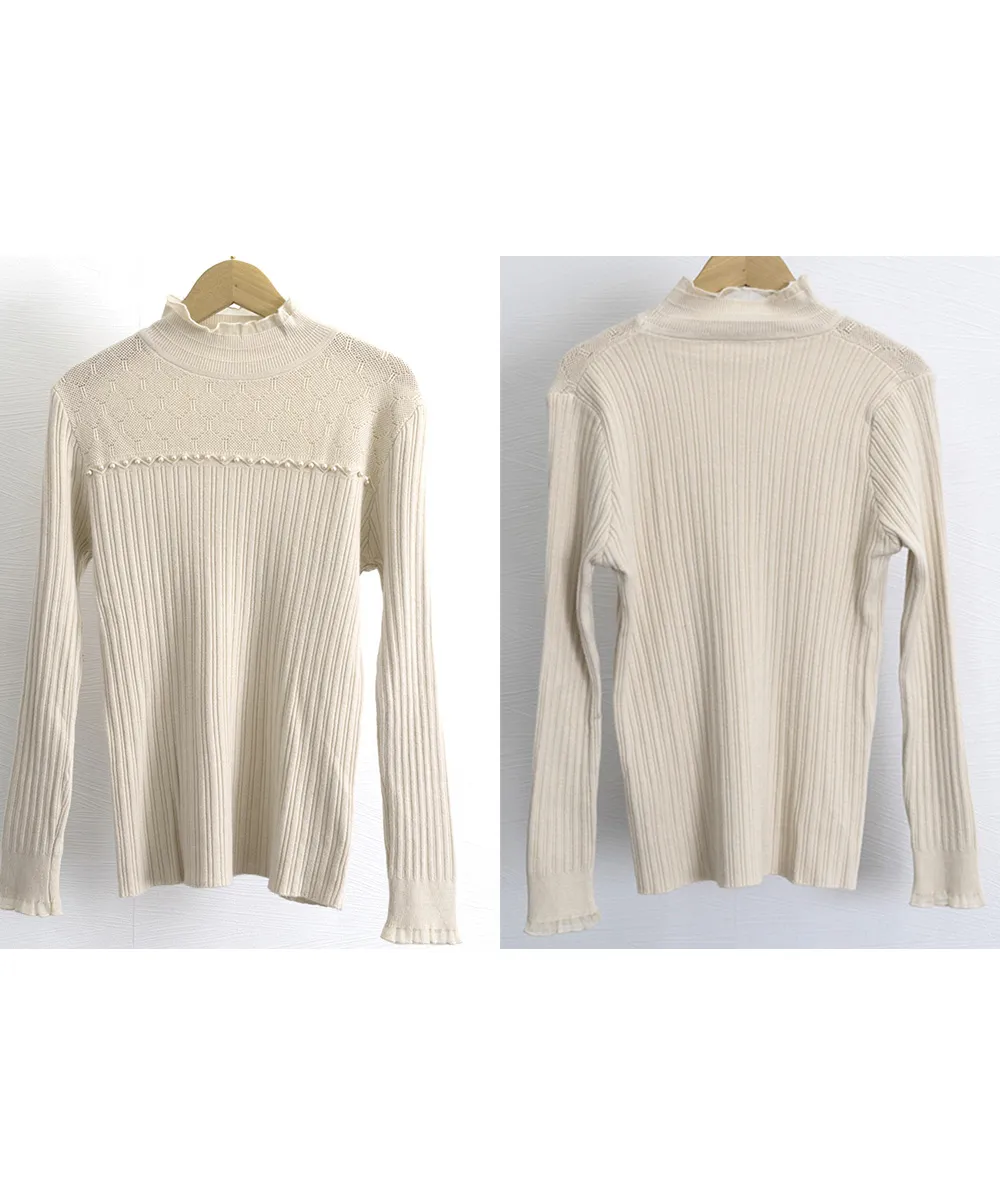 細リブが縦ラインを強調し、襟と袖口に施されたメロウフリルが大人可愛い、ハイネックのニットトップス