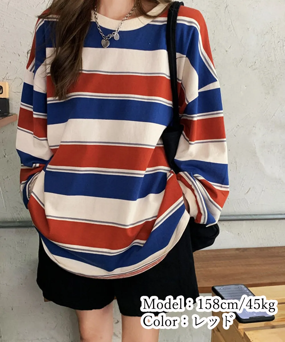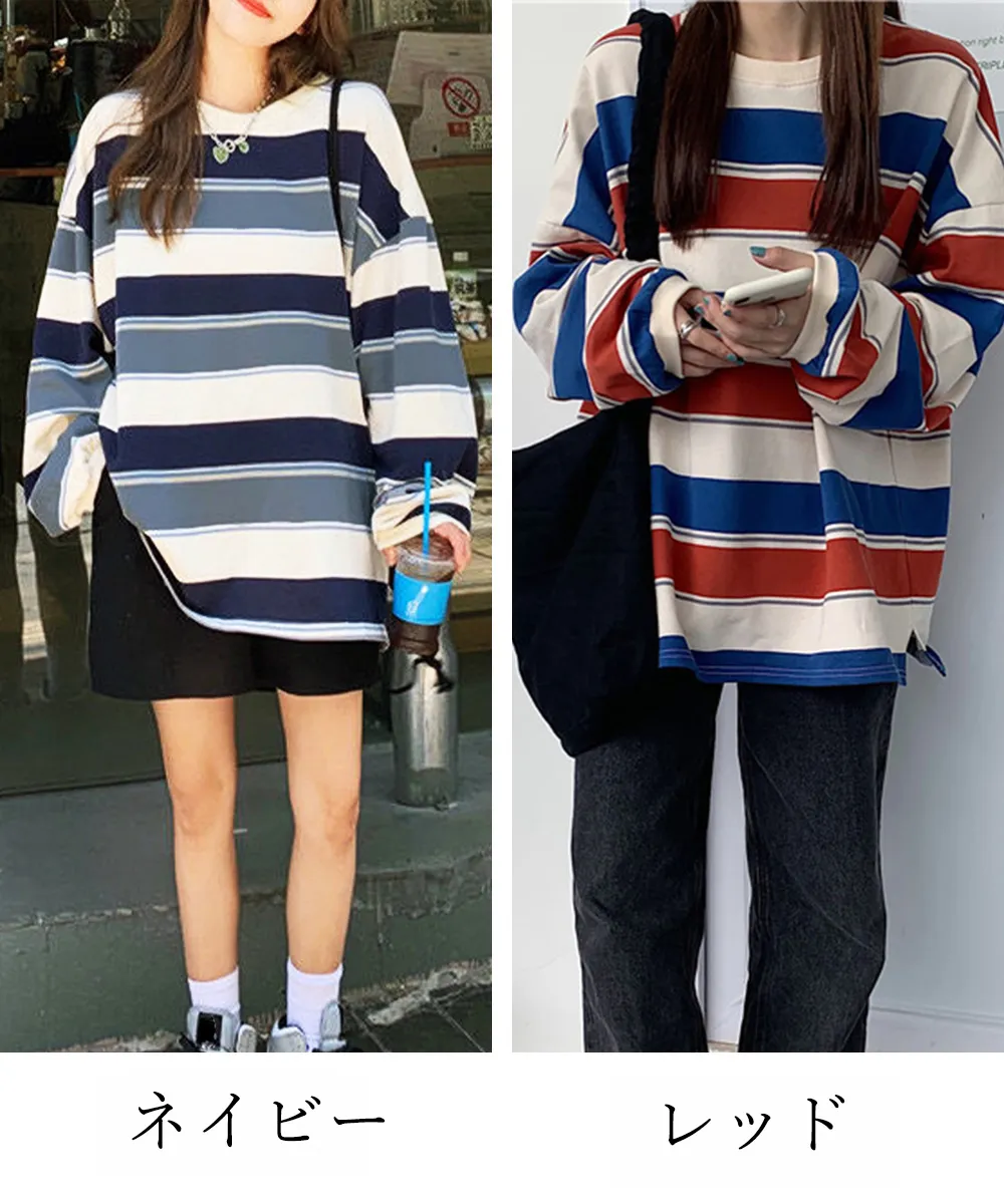 レディースボーダー柄スウェット配色トレーナー ゆったり体型カバー 大人カジュアル春秋向け ネイビー/レッド