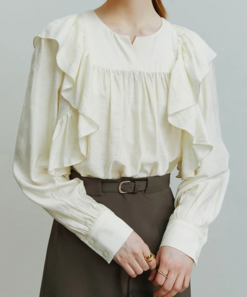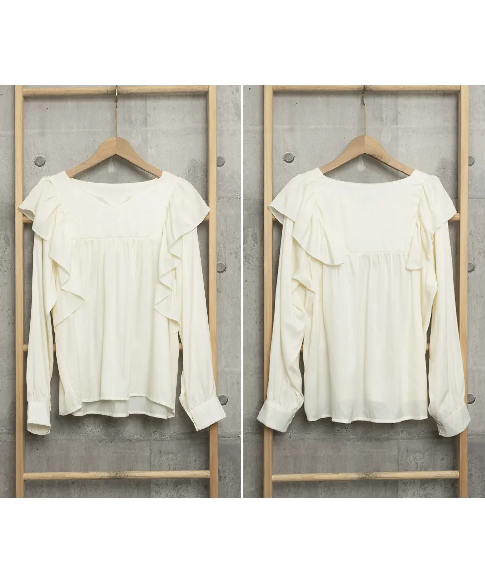肩から胸元にかけて大きめのラッフルフリルデザインが目を惹く主役級のブラウス